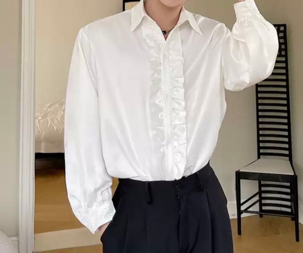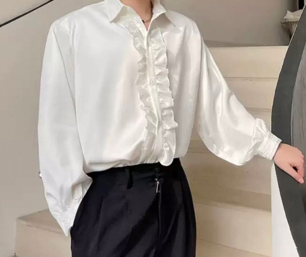 メンズ向けのシャツに、フリルフロントが特徴的な商品です。