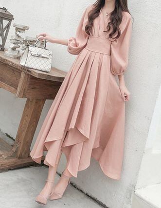 パーティードレス ボリューム袖 Vネック 無地 ミモレ丈 Aライン